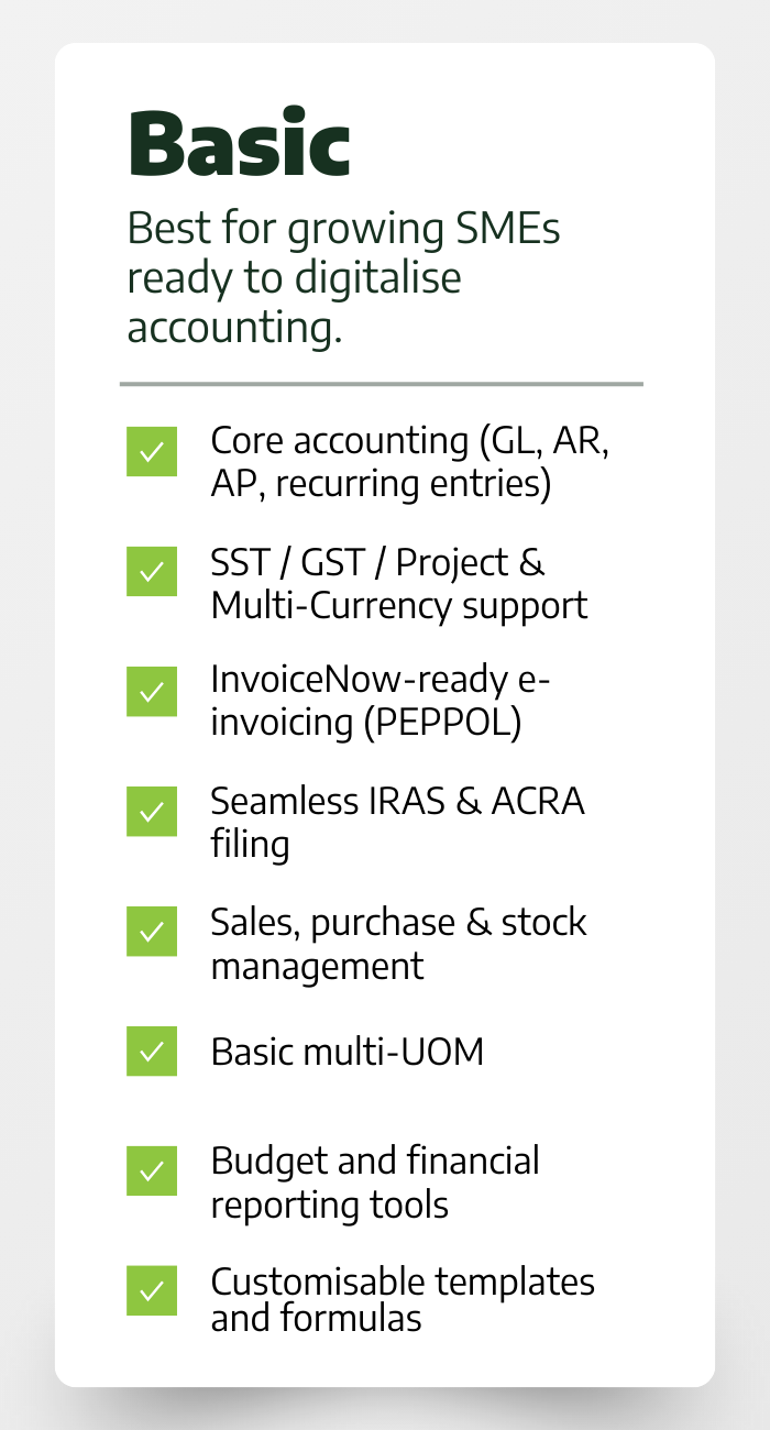 All editions are InvoiceNow (PEPPOL) ready and eligible for up to 50% PSG Grant support for qualified SMEs.